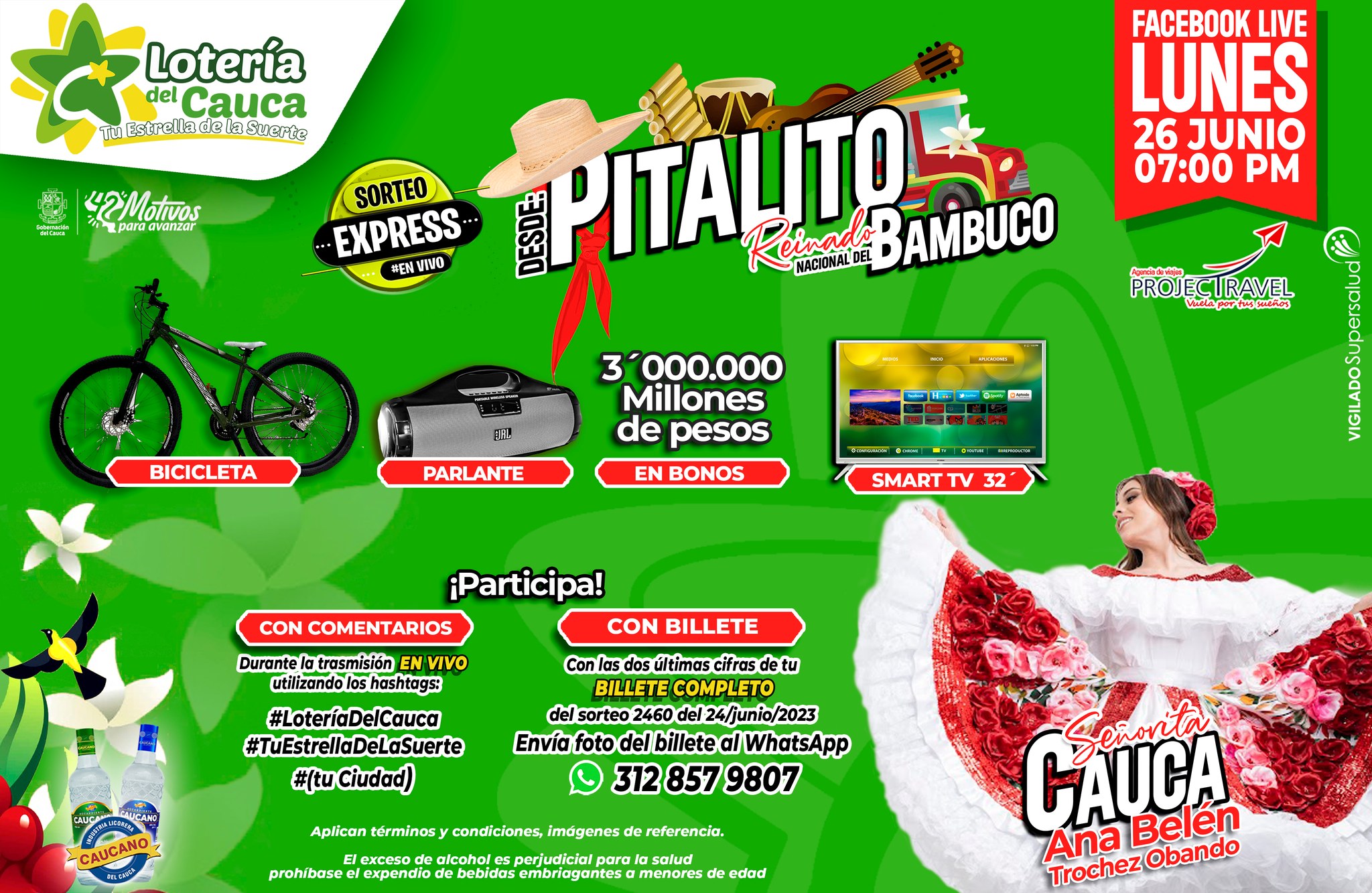 Estamos de #ReinadoNacionalDelBambuco Conéctate este lunes 26 de junio #EnVivo 07:00 pm por la fan Page de tu Lotería del Cauca y participa en nuestro #SorteoExpress.
