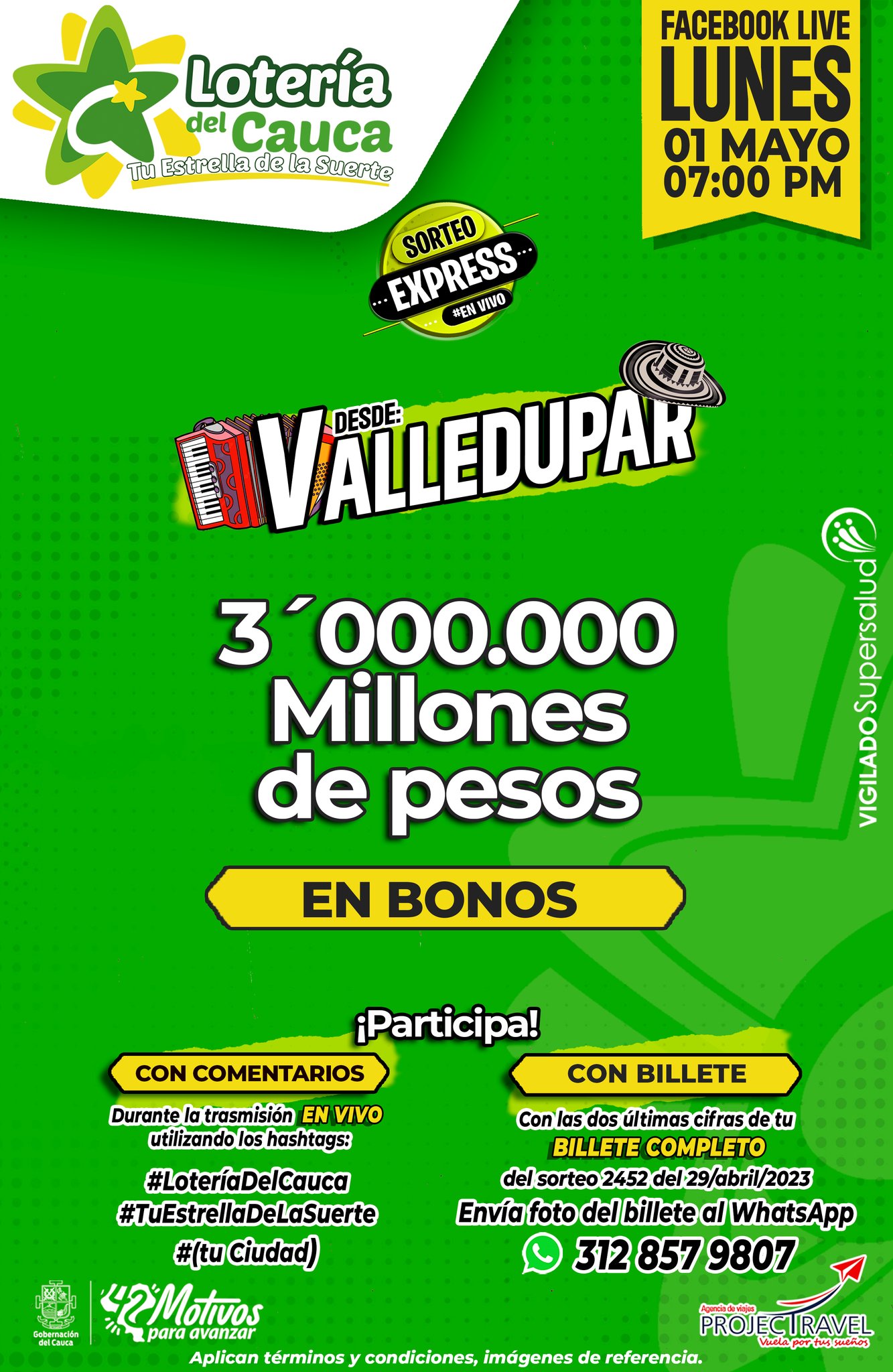 !Compra ya! el billete de tu Lotería del Cauca del sorteo 2452 que juega este 29 de abril y participa #EnVivo con las 2 últimas cifras en nuestro #sorteoexpress este lunes 1 de mayo a partir de las 07:00 pm desde Valledupar.